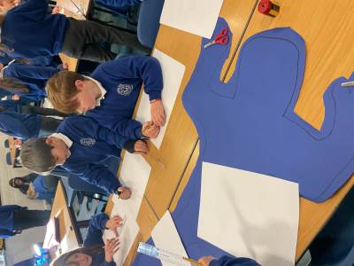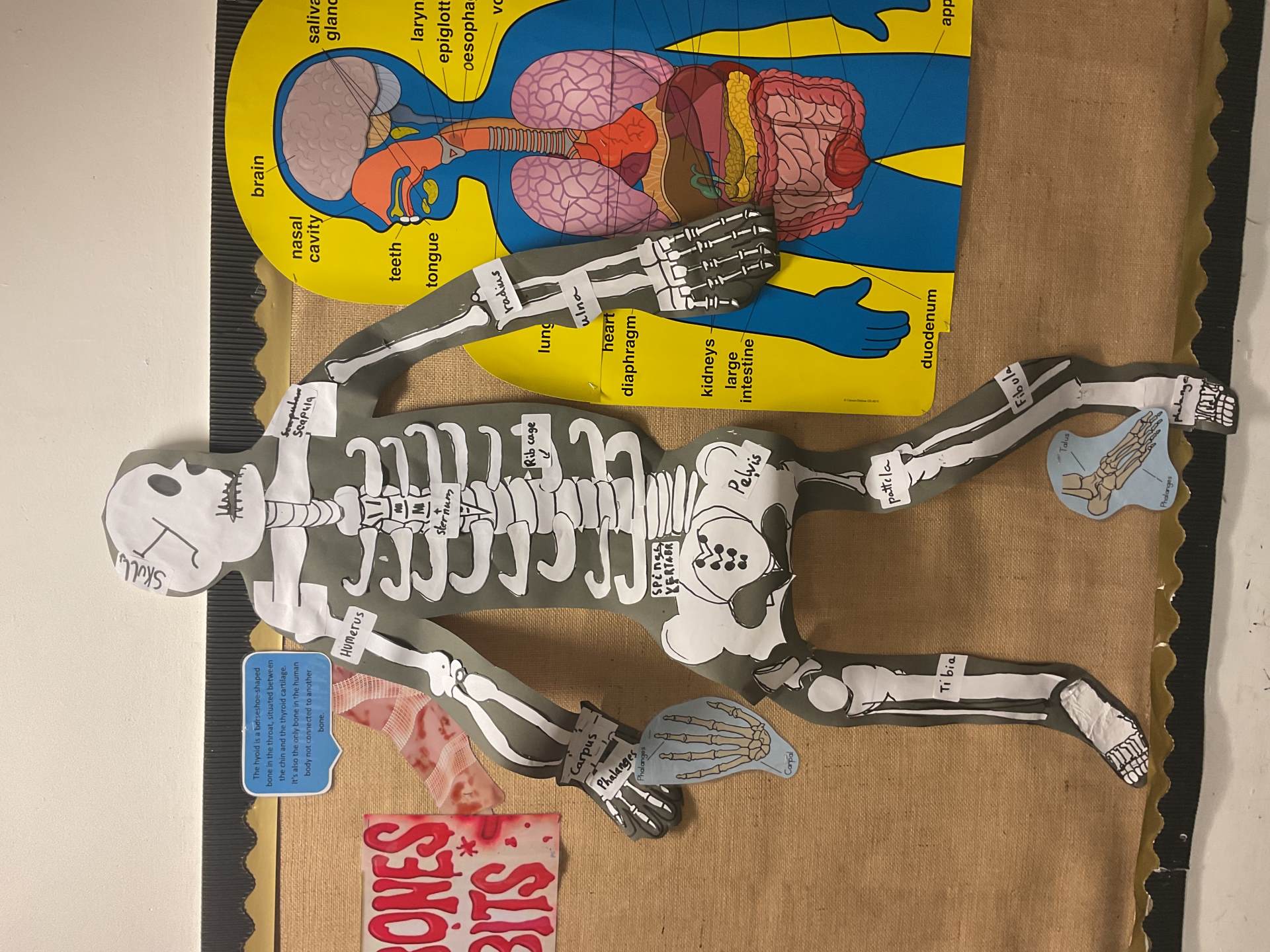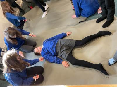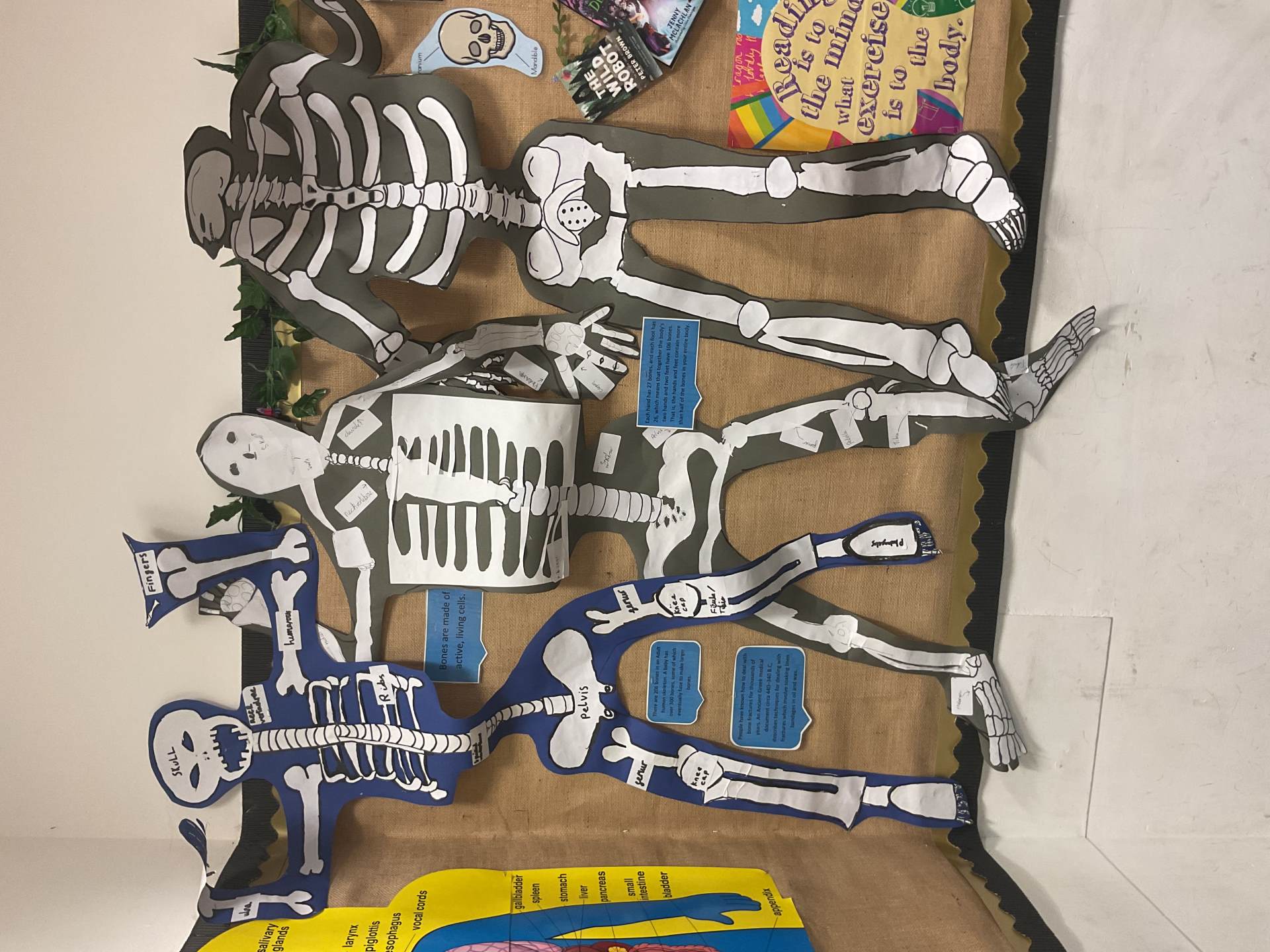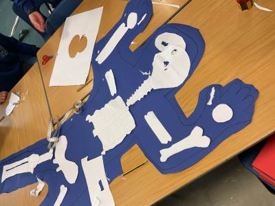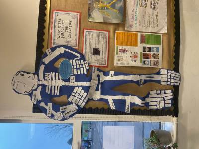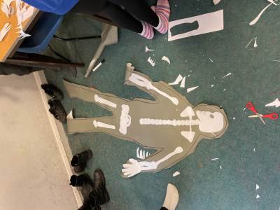 Year 5 had lots of fun creating their own skeletons from scratch! They drew around a pupil in their group, measured lengths of limbs and created bones to go inside their body outlines. We hope you like the finished articles!