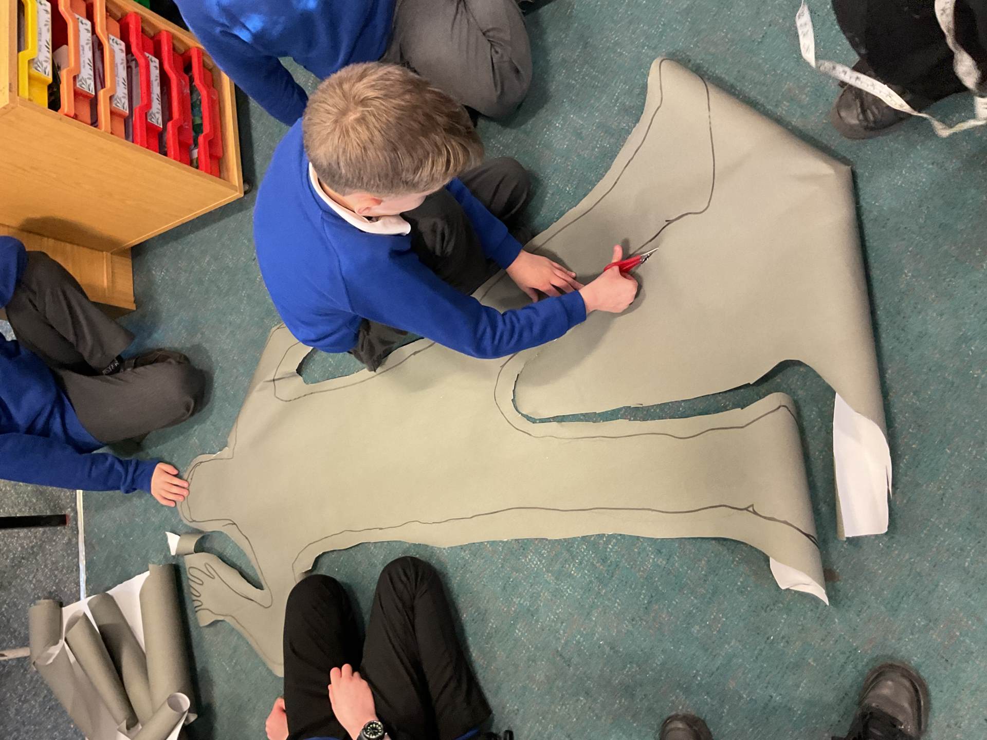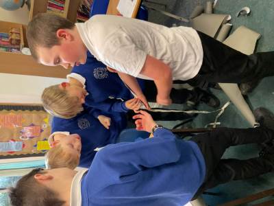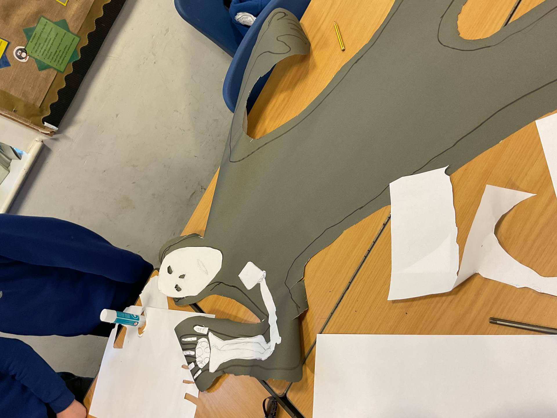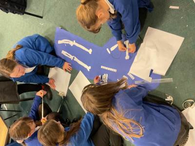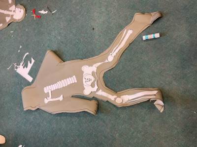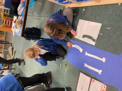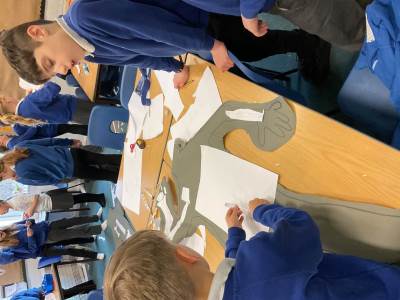 Year 5 had lots of fun creating their own skeletons from scratch! They drew around a pupil in their group, measured lengths of limbs and created bones to go inside their body outlines. We hope you like the finished articles!