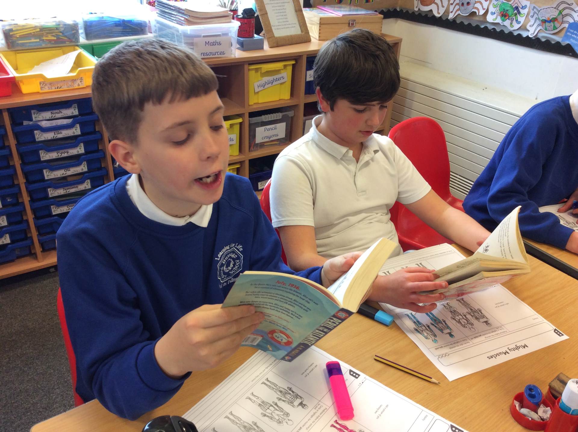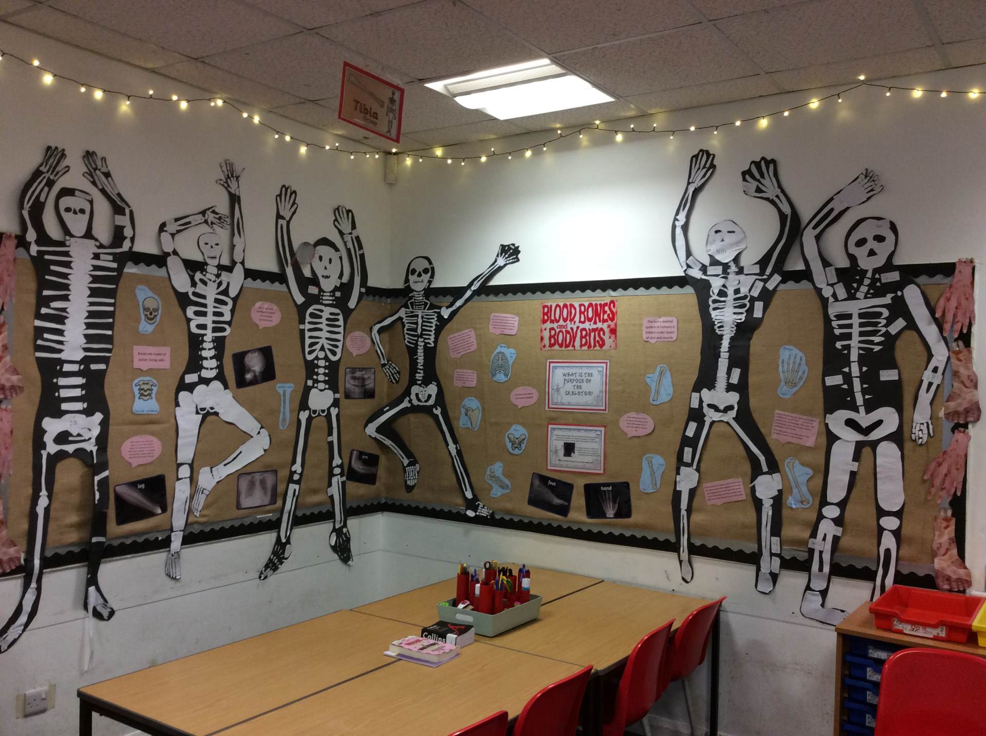 Class 6 had a fantastic time creating life-size skeletons. They began by researching the bones of the human body, then worked in groups to draw around one team member. Using careful measurements, they recreated the bones to build their own skeletons. Take a look at our classroom display below!